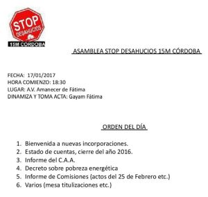 Os convocamos a la Asamblea de Stop Desahucios 15M Córdoba el próximo martes 17 de enero, a las 18:30h, en la AV Amanecer de Fátima, con el siguiente orden del día:
