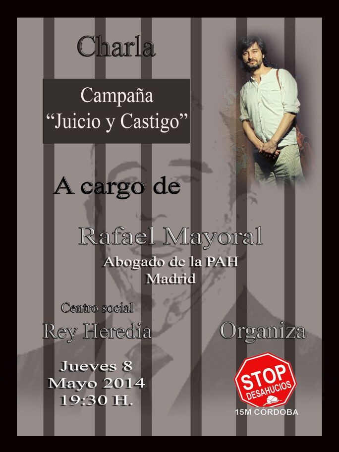 El próximo jueves, 8 de mayo, a las 19:30 en el Centro Social Rey Heredia, el comPAH Rafa Mayoral nos impartirá una charla sobre la campaña creada para exigir «Juicio y Castigo» a los responsables de la estafa hipotecaria.