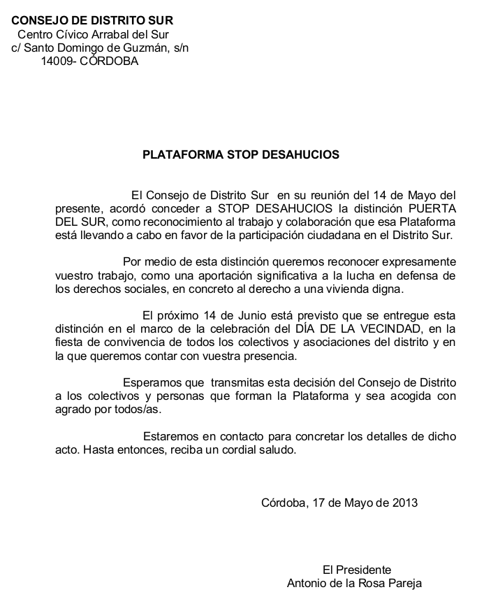 El Consejo de Distrito Sur ha tenido a bien galardonarnos con la distinción PUERTA DEL SUR reconociendo nuestro trabajo en la lucha por una vivienda digna para todos y todas. Desde aquí les agradecemos este premio.