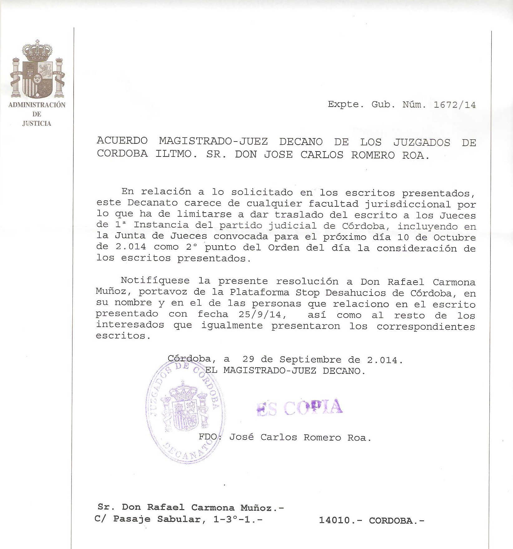 Esta es la respuesta que nos da el Juez Decano de Córdoba a nuestra petición de paralización de las ejecuciones hipotecarias en base a la sentencia europea de 17 de julio de 2014: que dará traslado del escrito que presentamos el 23 de septiembre a los Jueces de 1ª Instancia del partido judicial de Córdoba.