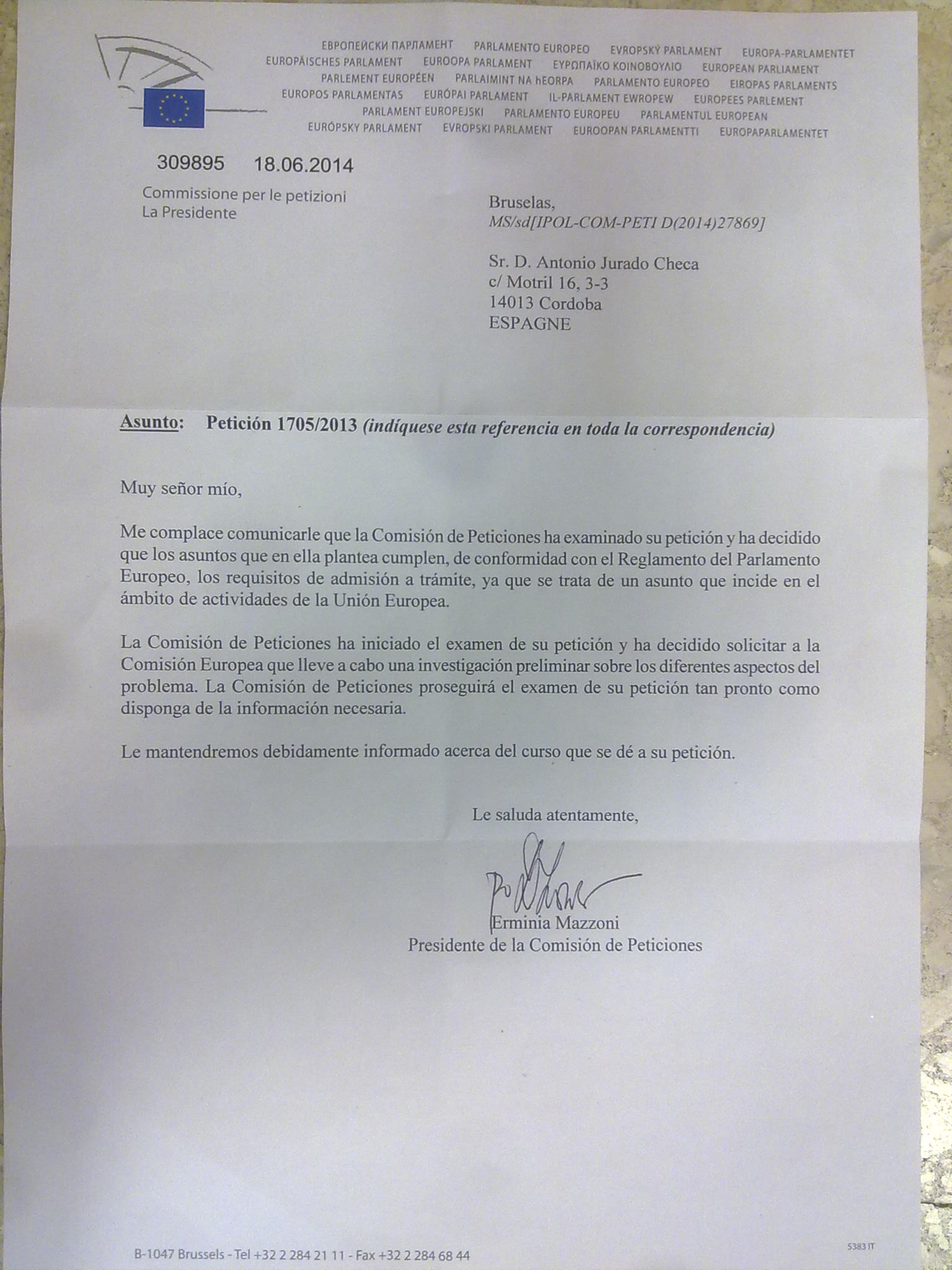 Pues bien, recientemente, la comisión de peticiones del Parlamento Europeo ha contestado a nuestro compañero Antonio y dicen que van a solicitar a la Comisión Europea que inicie una investigación preliminar. La carta de respuesta la tenéis al principio de esta entrada.